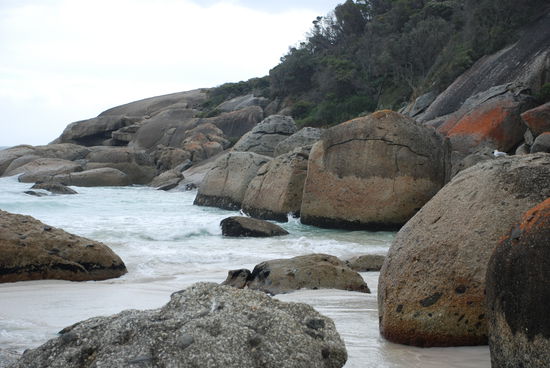 Bei wunderschoenem Wetter, Sonne wohin das Auge blickt fahren wir los und als wir beim Wilson Prom ankommen, regnet es. Wie kann das denn sein. Hallo? Wenn Engel reisen heisst es!!!!