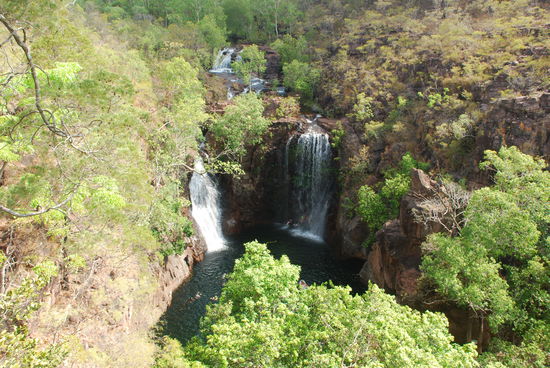 Jemand haette ein Foto von mir machen sollen, als ich morgens total verschlafen, noch halb betrunken und mit einem smilen auf meinem Gesicht, das von hier bis nach Germany haette reichen koennen, mit meinem mehr schlecht als recht zusammengepackten Sachen an der Strasse vor unserem Hostel auf Severine warte. Ein Chaosmorgen beginnt! Insgesamt dauert es ca. 2 Stunden bis wir alle eingesammelt haben und auf dem Colesparkplatz unser gesamtes Gepaeck (5 Backpaecks, 3 Zelte, Lebensmittel, Trinkwasser, Kuechenutensilien und mein Didge) zweimal ein und wieder ausgepackt haben. Irgendwann scheint dann alles seinen fuer ihn bestimmten Platz gefunden zu haben, so dass nur noch WIR die Sitzplatzverteilung regeln muessen. Selbstverstaendlich finde ich mich kurze Zeit spaeter auf dem "Kinderplatz" in der Mitte wieder, was mich an diesem Tag allerdings auch nicht so stoert, da ich hier wunderbar vor mich hin doesen kann und von einem Schlaf in den naechsten falle. Nach 1,5 Stunden erreichen wir dann unseren fuer heute bestimmten "Spielplatz": Litchfield NP mit seinen unzaehligen Wasserfaellen und Fluessen. Als wir aus dem Auto steigen trifft uns dann aber erstmal der Schlag und ich denke kurz darueber nach unseren Lunch hier im Auto einzunehmen und die Wasserfaelle ausfallen zu lassen: es ist unbeschreiblich und abartig heiss. Einfach nur existieren und atmen fuehrt schon dazu, dass ich nach 3 Minuten klatschnass geschwitzt bin. Und der Schatten bringt nur eine kleine Linderung. Das einzige was ein wenig hilft ist unsere Sandwitchs halb im Wasser sitzend zu essen. In diesen Tagen weiss ich zum ersten mal in meinem Leben eine Klimaanlage zu schaetzen (und das nachdem ich bereits drei Monate in Asien getravellt bin. Das will was heissen!) Frisch gestaerkt machen wir uns dann auf zu unserem eigentlichen Besuchsgrund: im Wasserfall schwimmen gehen. Vorher muessen wir jedoch noch ca. 20 Minuten Treppen runter laufen (Was bedeutet das? Richtig, die muessen wir dann auch irgendwann wieder rauf!) bewaeltigen bevor wir uns schliesslich in die Fluten stueren duerfen. Mit hundert anderen! Obwohl Freitag ist sind wahnsinnig viele Einheimische auf die gleiche Idee gekommen, mann koennte ja im Litchfiled NP schwimmen gehen. Aber ich kann euch an dieser Stelle nur sagen, das wir in den naechsten Wochen noch genuegend einsame und verlassene Spots zum schimmen finden werden und wir keine davon ausgelassen haben. Wir verbringen also die naechsten Stunden damit das kuehle Nass zu geniessen und unsere Koerpertemperatur wieder in den Normbereich zu bekommen. Was der Rueckweg zum Auto dann auch sofort wieder aendert.