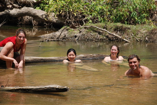 Hier gehen wir nochmal unsere Vorraete ein wenig aufstocken und fahren dann wieter zu den Hotsprings von dennen uns alle vorgeschwaermt haben. Ihr fragt Euch wahrscheinlich "Haeh, warum das? Habt ihr es nicht schon heiss genug? Warum noch Hotsprings?" Man soll angeblich ganz toll danach schlafen koennen (wenn man damit am Nachmittag startet, wenn die groesste Hitze vorbei ist). Und ja es ist klasse. Wir haben das Glueck eine Stelle im Fluss zu finden, wo wir zwischen heissen und kalten Stroemungen hin und her wechseln koennen, so dass ich mich sofort auf ins kalte mache wenn es mir zu heiss wird. Wir verbringen also den Rest des Tages damit "Kneipp auf ozzi" zu praktizieren bevor wir wieder unsere Zelte aufschlagen, gemeinsam kochen und einen weiteren Abend mit meinem Didge und quatschen verbringen.