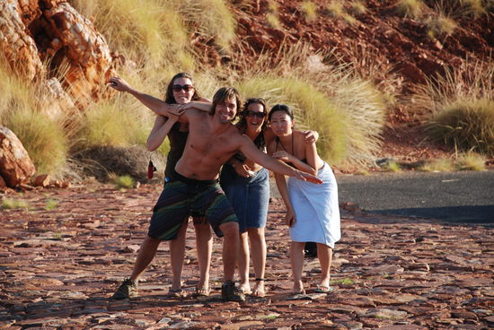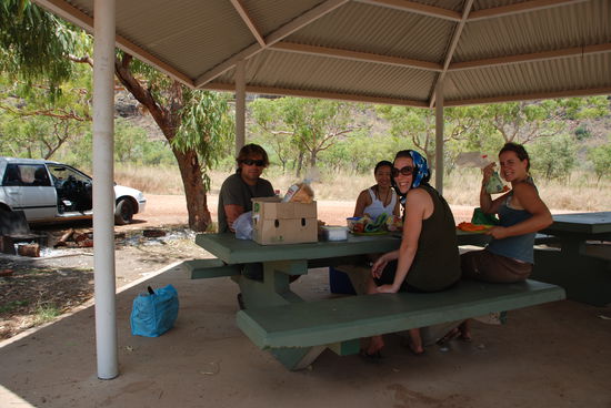 Unsere Tage starten frueh in dieser Zeit. Bereits kurz nach Sonnenaufgang, so um die 5:30 rum, heizt sich unser Zelt bereits so stark auf das wir spaetstens um 6:00 am fruehstuecken sind. Entsprechend sieht man uns gegen 7:00 ueber die Strassen vom Northern Territory flitzen. Heute ist wieder einer dieser Reise-Reise Tage. Da wir in den letzten beiden Tagen ein wenig getroedelt haben muessen wir heute ein paar Kilometer gut machen. So um die 500 k' schaetzungsweise. Bis auf einen kurzen Stop an einem Fluss, einem Lunchbreak und dem Border crossing vom Northern Territory nach Western Australia rein passiert also nicht viel. Aber dafuer hat sogar das Broder crossing etwas lustiges: nehmen sie nun unseren Wagen auseinander um nach Fruechten und Gemuese zu fahnden??? Ja ihr lest richtig! In Australien ist es strengstens untersagt Obst und Gemuese und andere "gefaehrliche Gueter" vom einem Staat in den naechsten zu importieren. Es koennten Krankheiten uebertragen werden. Als ich die Grenzen mit Nina ueberfahren habe, haben wir noch rumgescherzt, dass die Einheimischen unter der Erde in den grossen Tanks sitzen, wo man alles Obst etc. reinwerfen soll und sich ueber die Bloedheit von den Touris freuen und wieder frisches Obst haben. Hier an dieser Grenze geht alles ein wenig verschaerft zu. Es gibt einen richtigen Grenzposten mit Kontrollen und so. Man sieht also an diesem Tag eine Gruppe von internationalen Backpackern vor der Grenze sitzen und soviel Obst essen bis uns allen sowas von uebel war sodass wir die naechsten drei Tage keine Banane und nix sehen wollten. Wegschmeissen ist fuer uns alle undenkbar geworden (wenn ich bedenke wieviele Lebensmittel ich in meinem "alten Leben" weggeworfen habe, bloss weil wir zu bloed waren die Woche richtig zu planen und uns deswegen alles weggeschimmelt ist!)