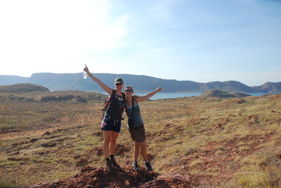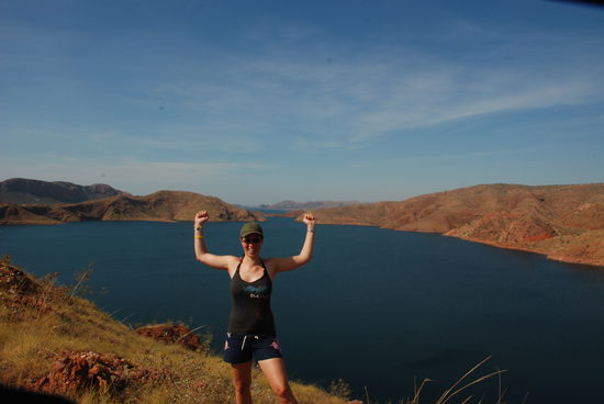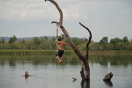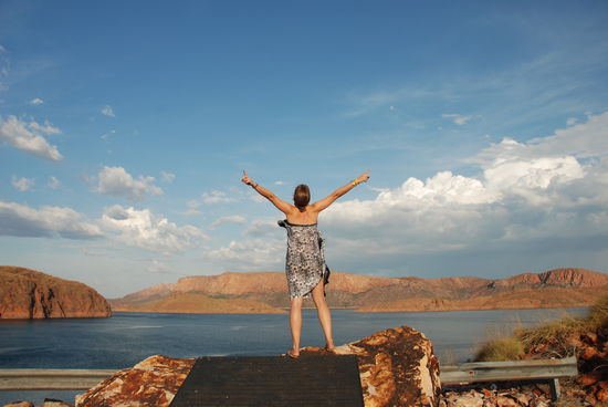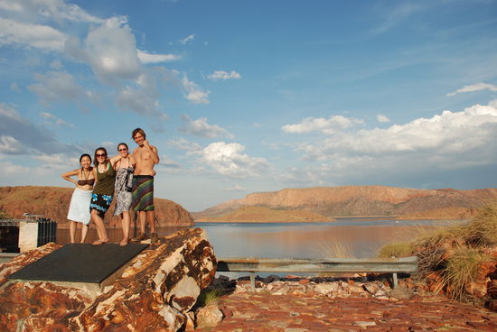 Unsere letzten 100k' des Tages fahren wir dann also in WA unserem neuen zu Hause fuer die naechsten Wochen. Was haben mir die Leute doch hiervon vorgeschaermt. Und ja es stimmt. Die Kimberleys, wo wir die naechsten Tage verbringen haben es in sich. Am fruehen Nachmittag erreichen wir dann endlich unseren Campingplatz am Lake Argyle, einer riesigen Seenlandschaft ein paar Kilometer von Kununurra entfernt. Heute goennen wir uns den Luxus einer dusche und einem Campingspot mit Elektrizitaet. Aber bevor wir diese Annehmlichkeiten nutzen wollen wir noch ein wenig den See erkunden und ein weiteres mal schwimmen gehen.