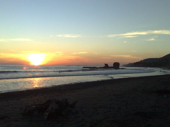 Nach der Grenze ging der Spass dann richtig los,Caesar sagte,dass er uns einen ausgaebe und wir uns aussuchen koennen,was wir wollen..Bier,Kurze oder anderes.Da ich aber kein Alkohol trinken wollte,schon gar nicht bei Hitze,hab ich mich fuer Eistee entschieden.Er lachte,fand es aber gut,dass ich mich nicht mitreissen liess,da alle Bier geholt habenAn der Kasse fiel mir dann wieder schlagartig ein,dass irgendwas von Dollar dir Rede war...Ich hatte durch Monterrico total vergessen,dass ich mein Geld wechseln musste.Nun hatte ich nur Quetzales mit;Caesar meinte,dass es keine Moeglichkeit zum wechseln gaebe,aber wir gern bei der naechsten Bank halten koennen,damit ich was holen kann.Hab mich natuerlich geargert,aber ich konnte wenigstens Geld holen,denn Banken sind hier an der Kueste so gut wie gar nicht zu finden(nur in groesseren Staedten)!!!An der Kueste angekommen,war ich sprachlos;ich wusste,dass El Salvador sehr schoen sein sollte,aber das hab ich nicht erwartet....es war perfekt!Die Nachmittagssonne am Horizont,das Wasser,die Palmen,die Felsen...ich konnte mich gar nicht sattsehen!Caesar hat gelacht,denn ploetzlich war es still im Bus,jeder war fasziniert vom Ausblick!Er fragte uns dann,ob wir in La Libertad halten wollen,dort gaebe es einen Fischmarkt,direkt am Wasser und wir koennten dort zur Bank gehen und im Supermarkt einkaufen-ich hatte von Mayra uebrigens einen Auftrag,sie fragte mich,ob ich der Familie ein bestimmtes Getraenkepulver mitbringen koennte,sie wuerden dafuer sterben;es ist naemlich nur in El Salvador zu kaufen!Somit passte es mir gut...In La Libertad angekommen,gingen wir uebern Markt,es war herrlich,ich kam mir vor wie im Film.Caesar hat dann ganz sponatn beschlossen,uns zum Essen einzuladen,er kaufte insgesamt 15 kg Fisch(Krabben,Garnelen,Krebse,Calamaris),das dann in unserer Finca zu einem Festmahl verarbeitet werden sollte.Alle freuten sich drauf!!!Haben dann im Supermarkt gehalten,jeder kaufte sich was zu Trinken,zu Essen und Suessigkeiten,hab dann auch Mayras Wunsch erfuellen koennen(sie hat sich tierisch gefreut!!!).In unserer Finca angekommen,huepfte ich wie ein kleines Kind durch das HausIch hatte was Einfaches erwartet,aber eine Finca auf Felsen gelegen,mit Aussicht aufs Wasser,dazu ein Pool,der direkt ueber der Klippe war...nein das hatte ich nicht erwartet!Dann ueberall Haengematten,schoene Blumen,nettes Personal,tolle saubere Zimmer...ein Paradies!Haben uns dann gleich alle ins Meer gestuerzt,das Wasser war herrlich warm,die Wellen ganz flach;der Sonnenuntergang hinter uns,ich war richtig gluecklich!Abends haben wir dann alle 1000Fotos gemacht und etwas Wein getrunken(ich wieder Eistee) und um 21Uhr gab es dann das Festmenue:es war sooooo lecker!
