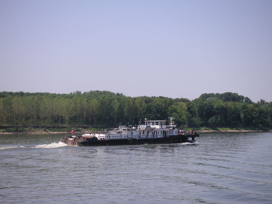 Bei Km 440 kommt uns die "Krems" entgegen. Ein Hupkonzert und ein Matrose, der mit seinem Wasserschlauch tolle Fontänen in den Himmel schickt - das ist eine würdige Begrüßung von zwei Schiffen mit österreichischer Flagge.
