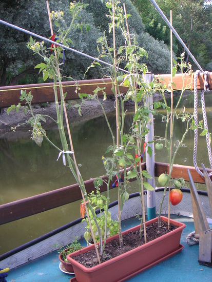 Wir ankern in starker Strömung hinter der Insel Gostinul. Mangels frischer Einkäufe ist Kreativität gefragt und zum Dinner im Abendsonnenschein gibt es eine neue Nudelkreation: Penne Tricolore in Knoblauch-Rahm-Soße und Paradeisersalat aus eigener Ernte.