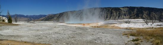Irgendwann erreichten wir das Geysirgebiet, in dem der Hauptgeysir "Old Faithful" heisst und ca. aller 90 min ausbricht. Wir hatten Glück, nach einer Viertelstunde Warten gings los. Die Fontäne steigt bis zu 50m in die Höhe und wird mit jeder Menge Dampf begleitet.
