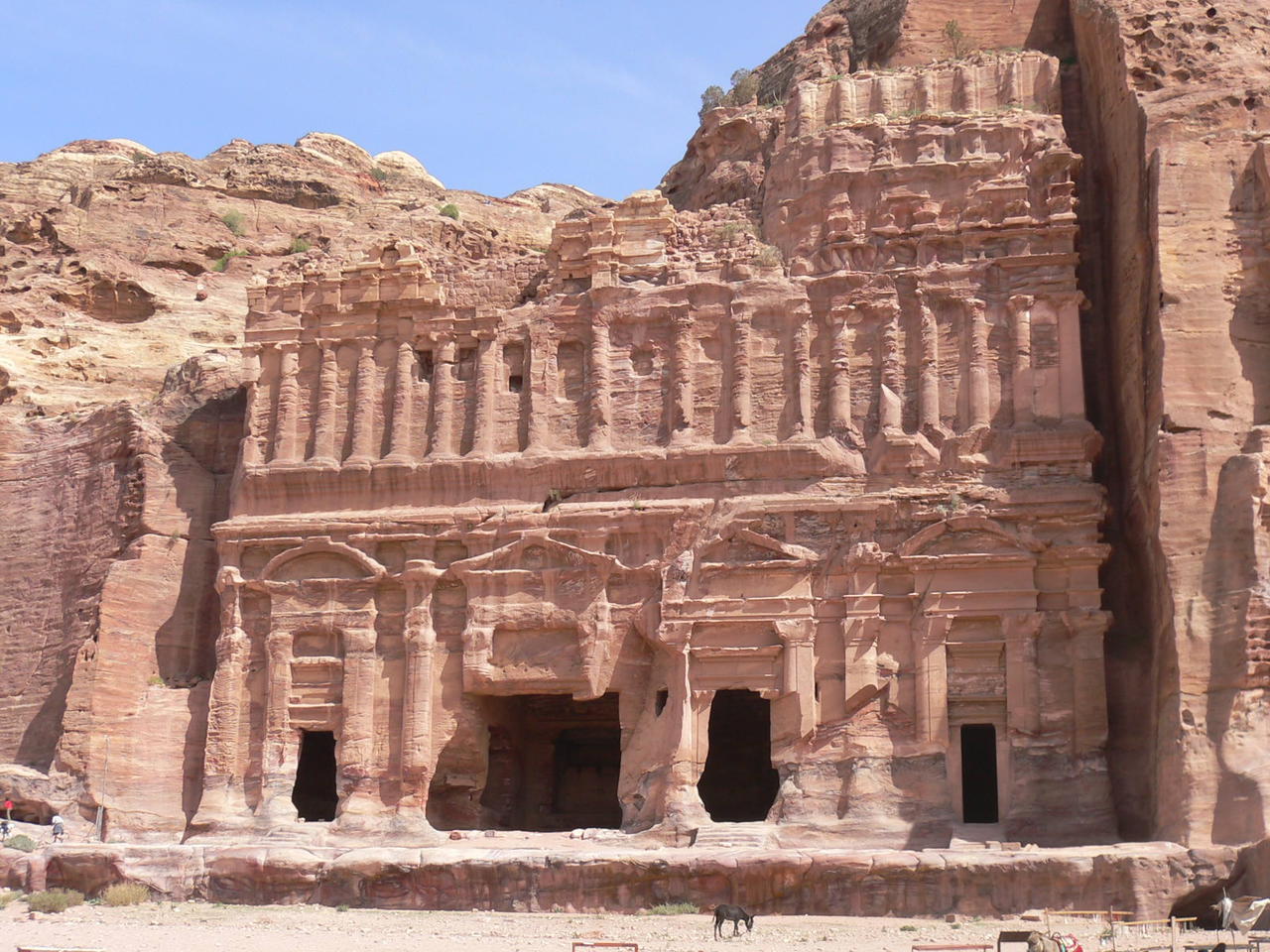 Nach dem Abstieg liegt vor uns noch einmal das gigantische Petra-Fels-Massiv mit den Königsgräbern, dem "Urnengrab" mit Vorhof und Haupthalle und einer grandiosen Akustik, dem "Seidengrab"mit seiner natürlichen Sandsteinmaserung in Grau, Rosa, Weiß und Blau, dem "Korinthischen Grab" (wegen der Säulen) und dem "Palastgrab" (Nachahmung eines römischen Palastes mit 4 Toren und 18 Säulen.