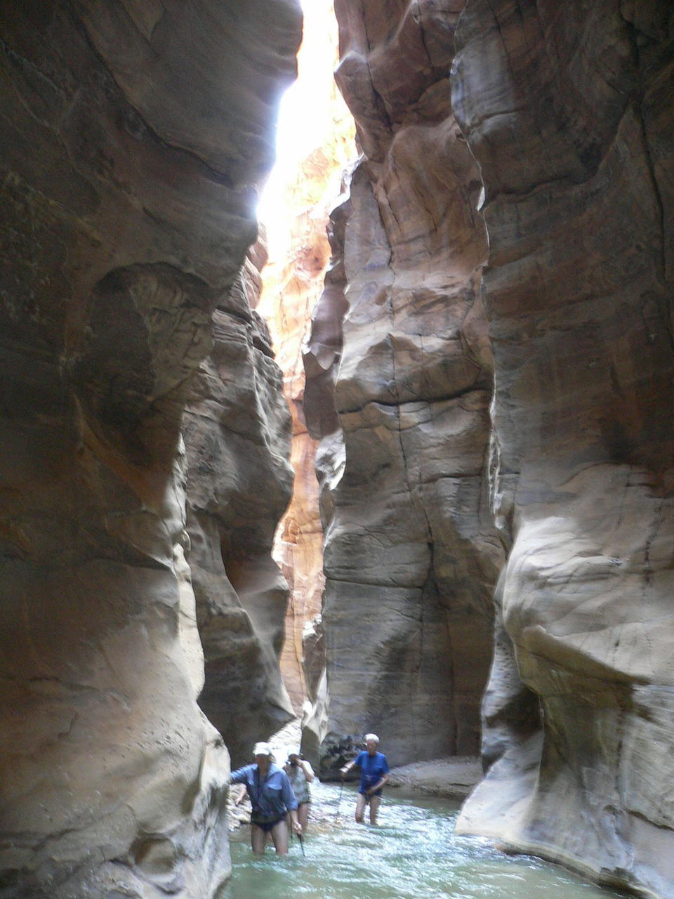 Zwei einheimische Ranger begleiten uns durch das Naturschutzgebiet. Bei der Einstiegsstelle des Wadi Mujib zweigt noch ein weiteres Tal ab, das "Wadi Hidan", das eine starke Strömung aufweist und zwischen ganz engen Felswänden verschwindet.