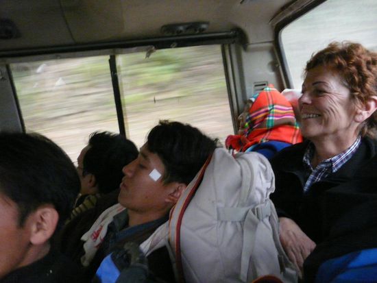Kurz vor sieben dachten wir, der Bus wäre voll, da klappten sie die Notsitze aus, so dass es nun keinen Gang mehr gab. Punkt sieben Uhr verteilte die Schaffnerin Speibsackerln. Für jeden eines, für Kinder zwei. Das versprach, eine angenehme Reise zu werden, gut, dass wir die letzte Reihe hatten. Nach einer halben Stunde sah Renate die ersten Blutspritzer auf den Seitenscheiben. Nach und nach wurden es immer mehr. Vom Dach tropfte Blut. Das Rätsel blieb ungeklärt bis zum Schluss, aber ich denke, irgendein armes Schwein wird dort oben ausgeblutet sein. Das war auch ungefähr die Zeit, als die ersten Sackerln gefüllt und über die Fenster entsorgt wurden. Wegen so etwas hält kein Bus in Vietnam, er hält nur, um noch weitere Leute einsteigen zu lassen. Bald saßen auf jedem Doppelsitz drei Leute, ich hörte auf zu zählen. Da immer mehr Leute einstiegen als ausstiegen, waren auch bald die Schoßplätze vergeben, die Schaffnerin knallte jedem Fahrgast ein Gepäckstück auf die Knie, der nicht schon jemanden drauf sitzen hatte. Nur uns verschonte sie. Vielen Dank an die strenge Schaffnerin im Bus Dien Bien Phu - Lao Cai! Vielleicht liest das wer und sie bekommt einen Orden. Renate bekam einen hübschen jungen Mann, der sich an ihre Knie lehnen durfte, weil die Rückenlehne seines Notsitzes kaputt war. Ein hübsches Paar.