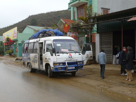 Ein weiser Entschluss ließ uns in Dien Bien Phu schon um 6 Uhr früh am Busbahnhof sein, was uns einen Sitzplatz in der letzten Reihe sicherte. Unsere Rucksäcke wurden wie fast alle anderen Gepäckstücke auf dem Dach verstaut. Nur bei uns hinten lagen Reissäcke auf dem Boden, die waren wohl zu schwer fürs Dach. Wir wussten also nicht, wohin mit unseren Füßen. Vor der Abfahrt hätte ich noch aufs Klo müssen, aber als ich die sanitären Einrichtungen sah, beschloss ich, es zehn Stunden ohne auszuhalten. Die Schlafstellen für die Busfahrer hatten vergleichbaren Standard.