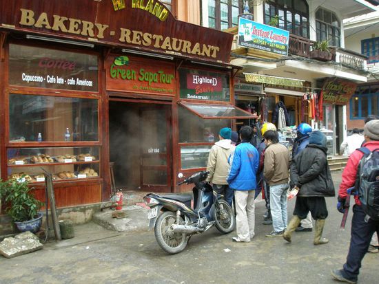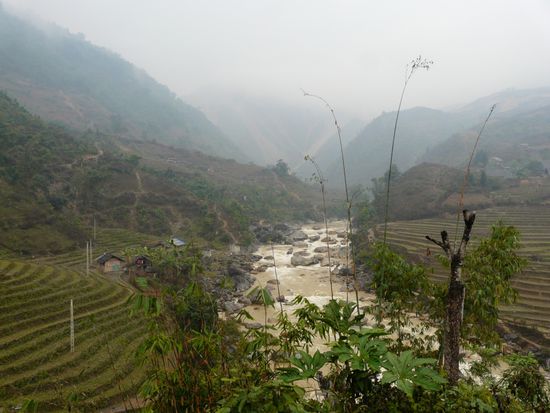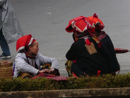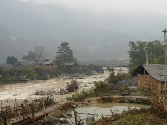 Die Gegend, durch die wir fuhren, war sehr einsam, oft gab es viele Kilometer lang keine menschliche Siedlung. Wir fuhren bis knapp an die chinesische Grenze, die Gipfel waren bereits jenseits. Dann wieder Richtung Süden, Richtung Sapa auf den Berg hinauf, als es endlich zwölf Uhr wurde. Heiliges Gesetz in Vietnam: Von zwölf bis halb eins ist Mittagspause. Das Gasthaus, bei dem der Bus halt machte, war aller unterste Kategorie, hier wollten und konnten wir nichts essen.