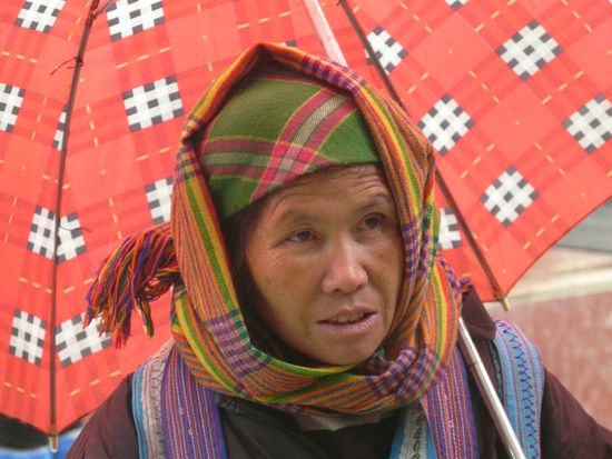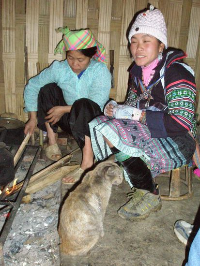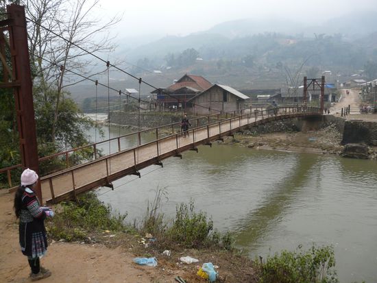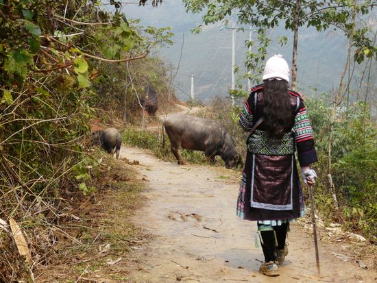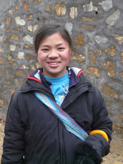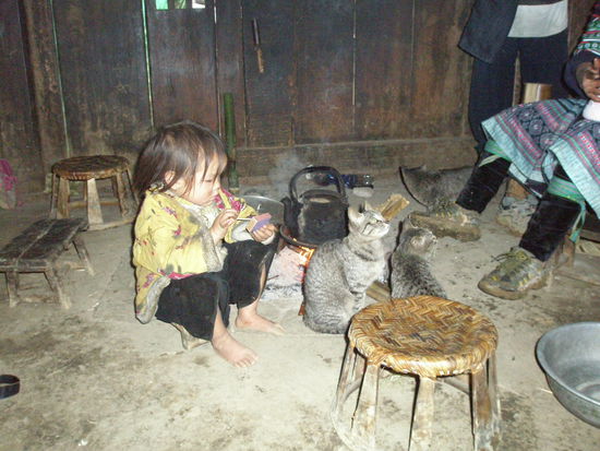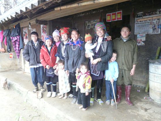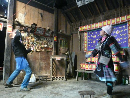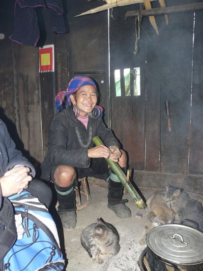 Ob wir eine Decke kaufen wollen, fragte die Mutter. Ja, wollten wir sowieso. Hübsche Frau, die Mutter. 49 Jahre alt, schaut aber 10 Jahre jünger aus. Ich kenne dort Zwanzigjährige, die älter aussehen als sie. Sie ist Schamanin, erzählte uns Ker beim Essen. Es gab Reis, Erdäpfel und gebratenen Bauernspeck. Schmeckte eigentlich gleich wie bei uns in den Alpen. Bergvolk ist Bergvolk, kann man sagen was man will. Ker schaut uns beim Essen auf die Finger. Ob Elfi beim Heiraten weit weg zu den Schwiegereltern gezogen ist? Daran wie jemand die Stäbchen hält, kann man das nämlich feststellen. Je weiter hinten ein Mädchen die Stäbchen hält, umso weiter wird sie von zu Hause wegziehen. Es bedeutete einigen Erklärungsaufwand, dass es bei uns nicht üblich ist, dass die Mädchen zu den Schwiegereltern ziehen. H'Mong-Mädchen können heute heiraten, wen sie wollen, erzählte uns Ker. Früher wurden sie von den Eltern verkuppelt, aber das ist heute nur mehr selten der Fall. Aber da die Mädchen mit ca. 12 Jahren beginnen, nächtelang an ihren schönen Trachten zu nähen, bis sie so zwischen 8 und 12 beieinander haben, werden sie wohl nicht all zu oft in ein anderes Volk einheiraten. Sie müssen nämlich die Tracht des Volkes tragen, dem der Ehemann angehört, und da wäre die ganze Arbeit umsonst gewesen. Vor allem heißt Heiraten Kinder kriegen, und dann ist kaum mehr Zeit zum Nähen.