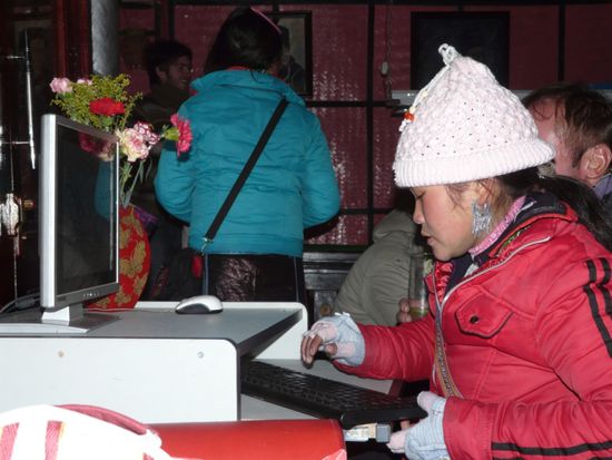 Nur hier in der Halle ist es noch etwas kälter, ich stehe mit Haube und Handschuhen hier und versuche einige Mails zwischen den Stromausfällen durch den Äther zu schicken. Ich fürchte, da wird heute nichts mehr, um acht holt uns Ker ab. Eigentlich warte ich auf Johnny, der versprochen hat, in einer Stunde mit den gewaschenen und getrockneten Schuhen zurück zu sein. Seit kurz vor sieben warte ich. Aber wie soll er eigentlich ohne Strom die Schuhe trockenen?