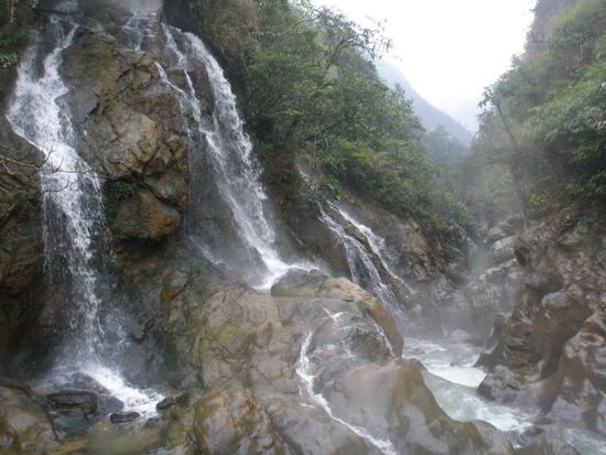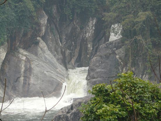 Also erfanden wir das Reisterrassenhüpfen. Hier waren die Terrassen noch ohne Wasser, sodass wir Stufe um Stufe hinunter springen konnten. Die Terrassen waren jeweils so ein bis eineinhalb Meter hoch und wir mussten nur darauf achten, mit beiden Beinen gleichzeitig zu landen, damit wir uns nicht die Knöchel verstauchten. Der Boden war nämlich schon sehr uneben, so wie ihn halt die Wasserbüffel hinterlassen hatten. Auch Ker fand Gefallen an der Hopserei und von einem Ohr zum anderen lachend sprang sie uns voraus. Als nächstes versuchten wir den Weg zum Wasserfall zu erkunden, aber auch der war uns zu schlammig. Von der Brücke über den Nebenfluss hatten wir allerdings ausreichend Sicht auf diesen schönen Wasserfall.
