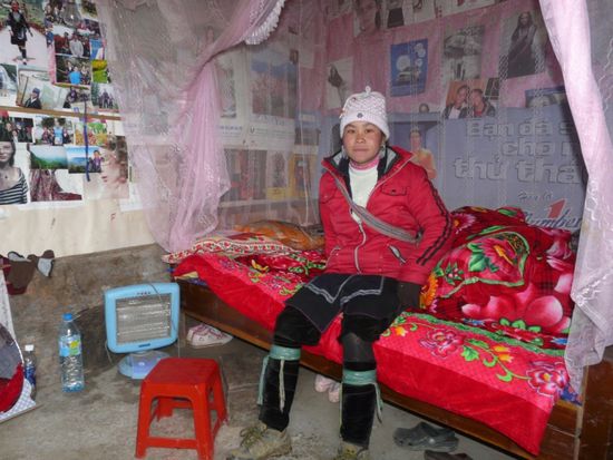 Ich platzte vor Neugier, also in ihre Wohnung. Wir gingen ein Stück den Berg hinunter, der Blick öffnete sich über das Tal, herrlicher Ausblick auf die Berge. Ker führte mich in einen Hof, von da in einen Hinterhof, und wir betraten ein Ding, das bei uns gerade noch als Saukobel durchginge. So wie viele Behausungen hat auch die hier kein Fenster. Wenn man Licht will, lässt man die Tür offen. Ker bewohnt dieses Zimmer gemeinsam mit ihrer Freundin Lan, und sie teilen sich ein Bett.