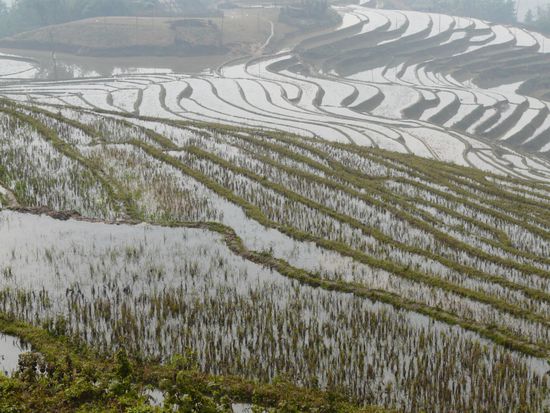 Bis zur Brücke über den Fluss sind die Wege betoniert, aber jenseits des Flusses gab es nur mehr Gatsch. Solange es eben zwischen den Reisterrassen dahin geht, noch kein großes Problem.