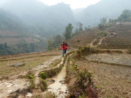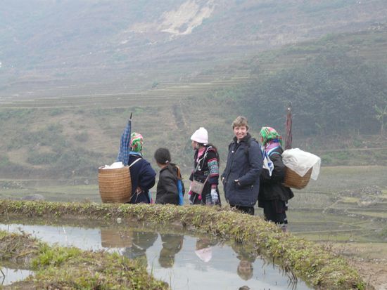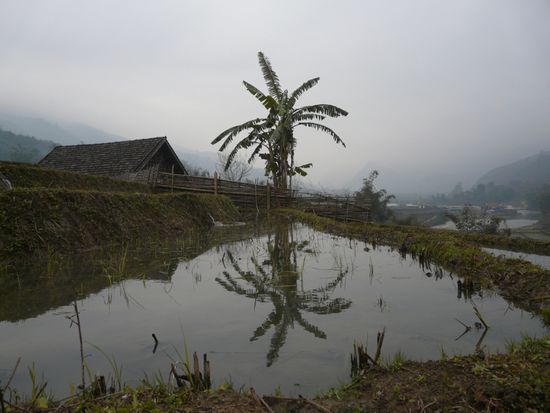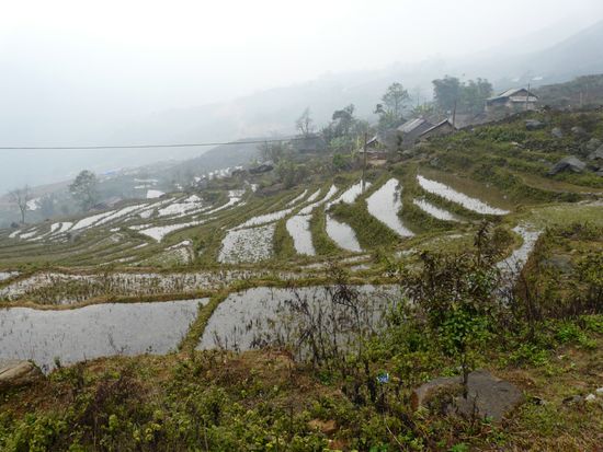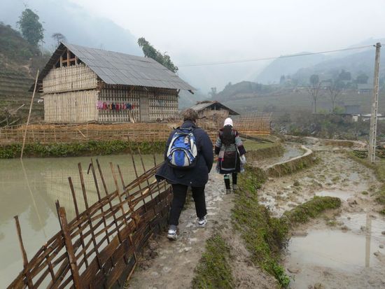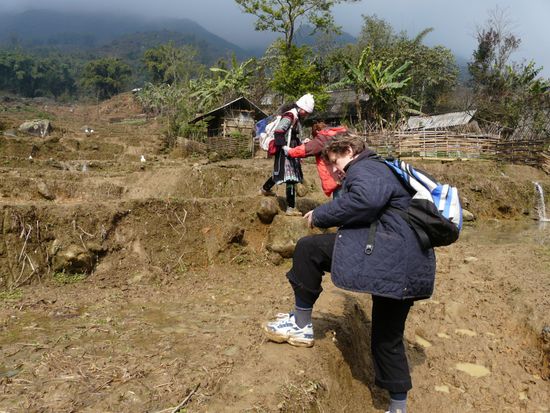 Hier wäre es länger auszuhalten gewesen, aber Ker drängte zum Aufbruch, wir hatten noch ein großes Programm vor uns. Sie wollte uns bei ihren Eltern vorbei bringen, und nach Ta Van wollten wir schließlich auch noch. Unser Fahrer bot all sein Können die Straße zurück hinauf, bis wir unterhalb von Kers Elternhaus anhielten. Da oben ist ihr Haus, zeigte sie. Wir sahen außer Reisterrassen nichts. Ker begann, hinauf zu steigen. Uns war nicht klar, wo sie gehen wollte, es war kein Weg zu erkennen, nur Reisterrassen, Schlamm und ein paar Steine. Wir turnten Ker nach, Elfi, ich, Renate.