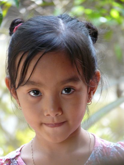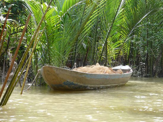 Auf einer der vielen Mekonginseln heißt es umsteigen in ein kleineres Motorboot. Einhorninsel, Schildkröteninsel, keine Ahnung, jedenfalls bahnt sich unser Boot den Weg durchs Palmendach des Kanals, stundenlang könnten wir so dahinfahren, vorbei an Fischer-hütten und im Wasser spielenden Kindern, vorwiegend jedoch an Palmen, Palmen, Palmen.