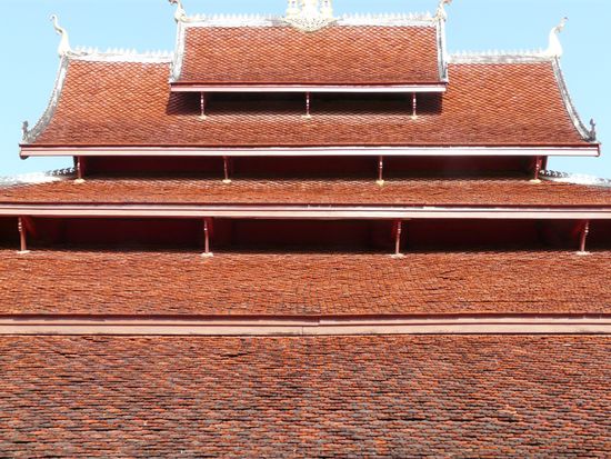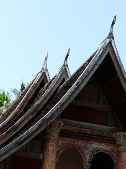 Es war sengend heiß geworden inzwischen, sodass Elfi und Renate keine Lust hatten, 20.000 Kip in die Besichtigung des Vat Xieng Thang zu investieren. Dadurch kann ich in den Genuss, es zwei Mal anschauen zu können. Ich lernte drinnen den Novizen Mexay kennen, einen siebzehnjährigen Burschen, der mich auf sein Zimmer bat, um mir seine Kamera anzuschauen, weil der Blitz nicht funktionierte. Also kamen wir ins Gespräch. Er versuchte, die Batterien für seine Kamera aufzuladen, nur waren das keine wiederaufladbaren. Hatte ja noch Glück, dass ihm die Batterien nicht um die Ohren flogen.