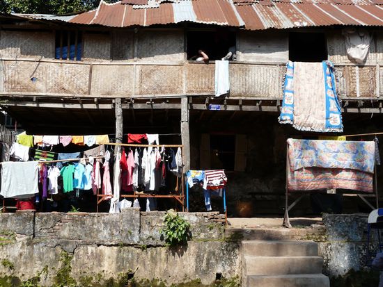 Neun Stunden reine Fahrzeit durch eine grandiose Berglandschaft. Wir waren froh, den VIP-Bus genommen zu haben, bequeme Sitze, angenehm ruhiger Fahrer. Einzig die Musikvideos waren eine Herausforderung. Ein Meer von Blut und Tränen, neun Stunden lang mussten die Mädchen dahinschmachten. Ich versuchte mich auf die Landschaft zu konzentrieren und auf die Häuser, die knapp zwischen Straße und Abgrund auf Stelzen dahinschwebten. Ich fürchte, die Kindersterblichkeit muss hoch sein hier. Gehen die Kids vorne beim Haus hinaus, werden sie von den zentimeternahe dahinbrausenden Bussen und LKWs platt gemacht, versuchen sie es hinter dem Haus, geht's hunderte Meter senkrecht in den Abgrund. Zumindest wilde Tiere verirren sich dort wahrscheinlich nicht hin.