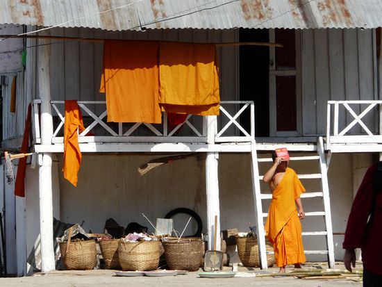 Mexay lud mich ein, dem Abendgebet um 18 Uhr zuzuhören. Dieses stammt aus Bali, es sind die Regeln für die Novizen. Klang nicht schlecht, sagte also zu. Woher er so gut Englisch konnte. Er besucht einen Englisch-Kurs. Im Kloster kann er zwar die Studienberechtigung erlangen, gibt aber keinen Fremdsprachenunterricht. Den muss er selbst bezahlen. Er will Englisch- und Laotisch-Lehrer werden und in sein Dorf im Norden zurückkehren.