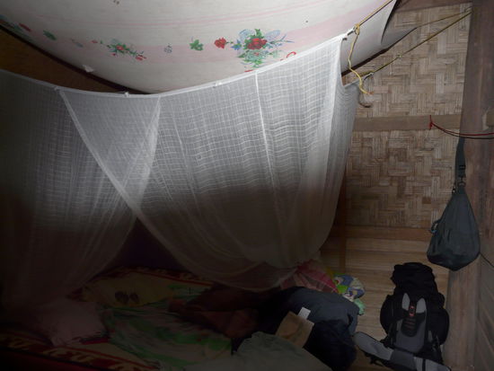 Mit unseren Taschenlampen suchten wir ein Gasthaus. Es gibt in diesem Dorf, das nur auf dem Fluss erreichbar ist, nur wenige Glühbirnchen. Das Essen war okay, also bestellten wir noch einen Bananenreis als Nachspeise. War vielleicht ein Fehler. Der Wirt hatte schon irgendwie erstaunt reagiert, das hätte uns ein Zeichen sein sollen. Bananenreis ist ein böses Wort. Das habe ich nun davon!