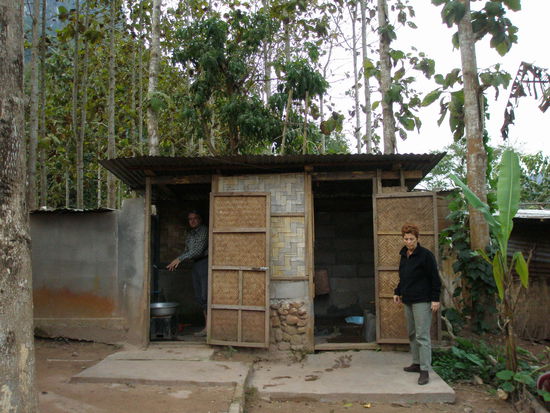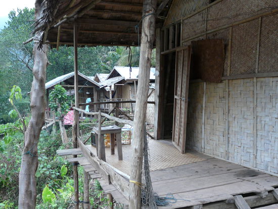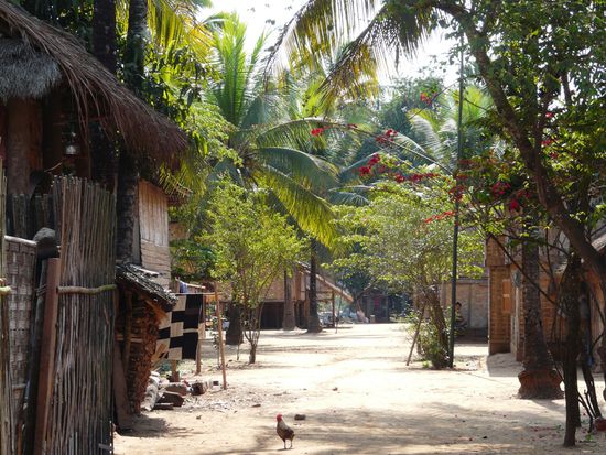 Wirklich sehr bald sahen wir die ersten Bambushäuser, ein nettes, sauberes Dorf tat sich vor uns auf. Einige Frauen lugten scheu hinter den Häusern hervor, der Rest des Dorfes wirkte wie ausgestorben, abgesehen von einigen Hunden, Enten und Hühnern, die sich missbilligend trollten.