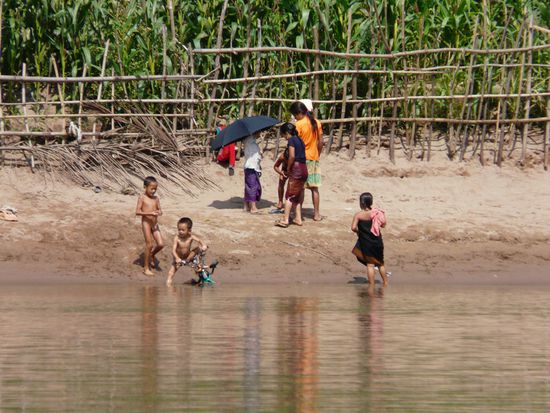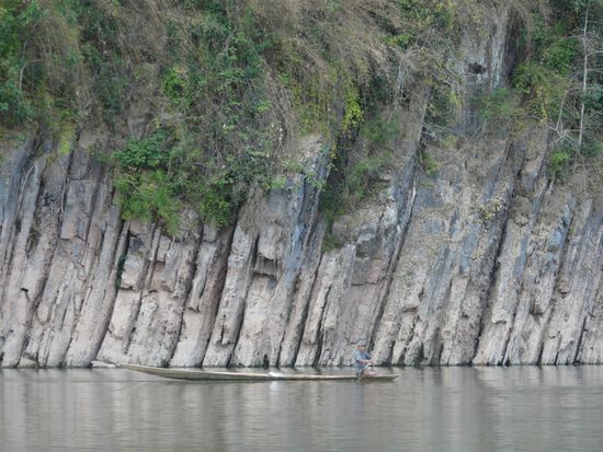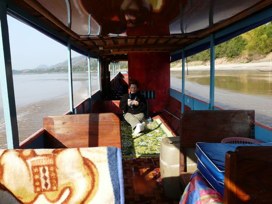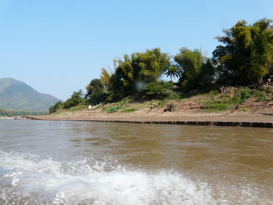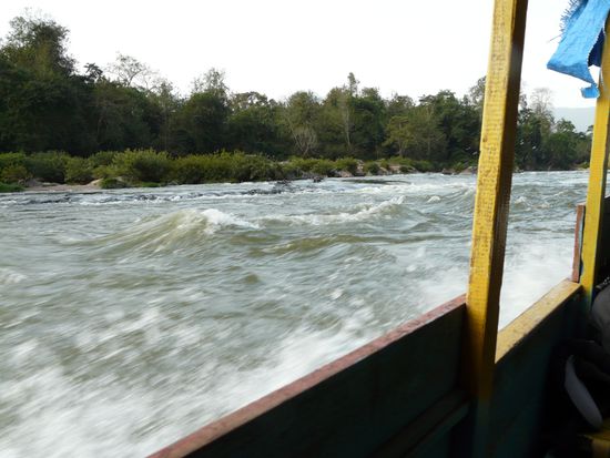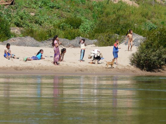 Teilweise fuhren wir unmittelbar am Ufer entlang, sodass wir die spielenden Kinder, Wasserbüffel und Schweine fast angreifen konnten. Permanenter Wechsel von senkrechten Felsen, Sandstränden, Gärten, Dschungel. Stromschnellen, dutzende Stromschnellen. Traumhaft schöner Tag, die Sonne strahlte vom Himmel. Mit dem beschaulichen Lümmeln allerdings war es vorbei, auf Handzeichen unseres Bootsführers mussten wir regelmäßig von einer Seite des Bootes auf die andere wechseln, wenn's haarig wurde, mussten wir auch noch den großen Benzinkanister von einer Seite auf die andere schieben, um noch mehr Gewicht zu verlagern, damit die Schiffsschraube zwanzig Meter hinter uns nicht auf den Felsen zerschellte, was mit hoher Wahrscheinlichkeit unseren Tod bedeutet hätte. Plötzlich ohne Motor mitten in den Stromschnellen würde unser über zwanzig Meter langes Holzboot zwischen den Felsen zerschmettert werden. Gedanken abschalten, Fahrt genießen. Wir wussten ohnehin nicht, was auf uns noch zukommen würde.