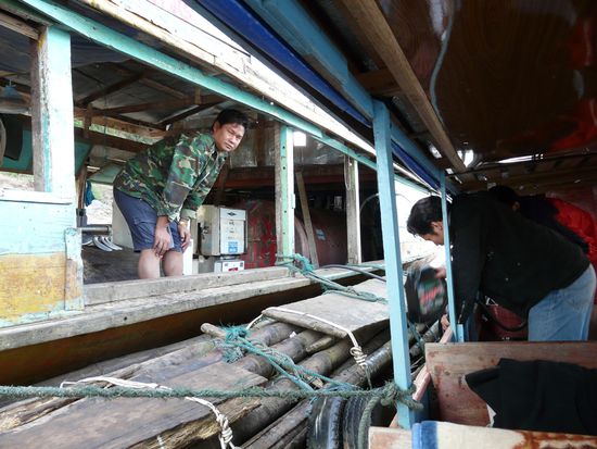 Kein würdiges Ende eines solch fantastischen Tages wie wir ihn hatten. Zu unserem Boot waren wir zwar erst mit einer Stunde Verspätung abgeholt worden, dafür lief unser Abholer im Laufschritt voraus, sodass wir mit unseren schweren Rucksäcken Mühe hatten, nachzu-kommen. Dafür hatten wir dann ein riesiges Langboot für uns alleine, echter Luxus.