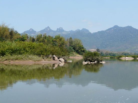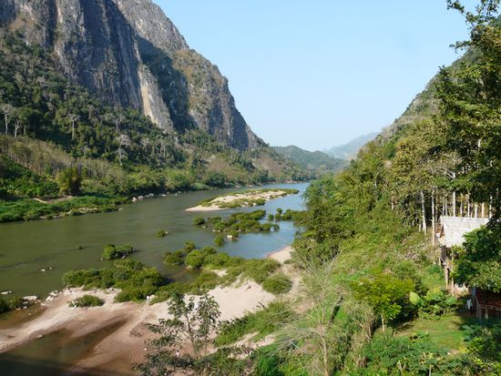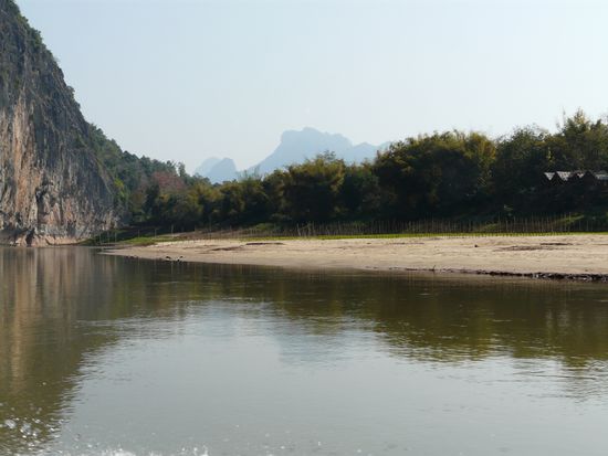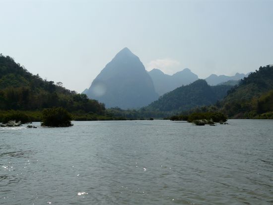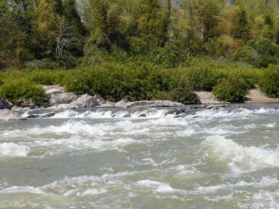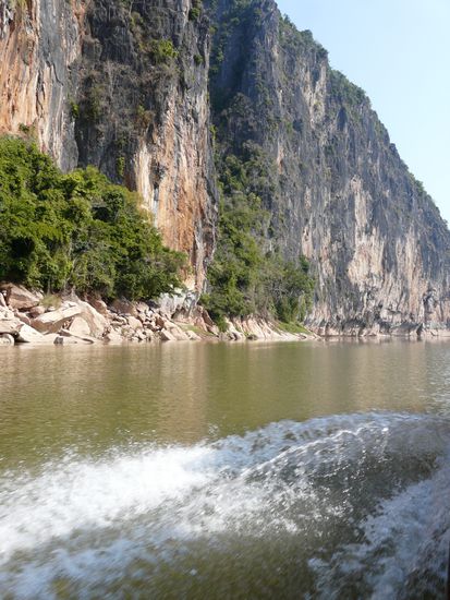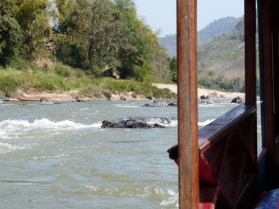 Etwas zu lange brauchten wir mit der Besichtigung, dann langte die französische Reisegruppe ein. Zeit, aufzubrechen. Gegenüber der Höhle bogen wir in den Nam Ou ab und es begannen die Stromschnellen. Wir bewunderten unseren Bootsführer vorbehaltlos, er wusste bei jedem Stein, auf welcher Seite er ihn zu umfahren hatte.