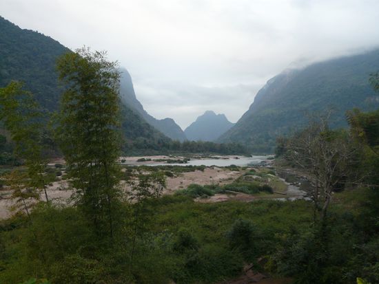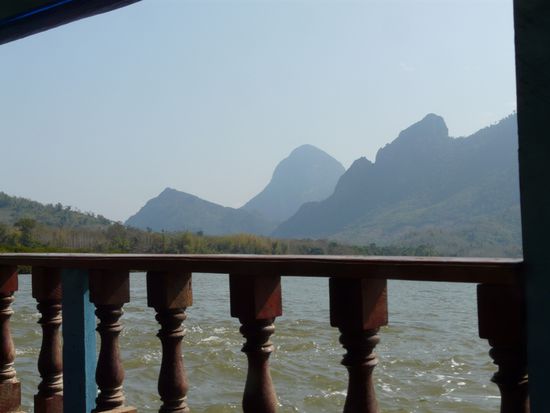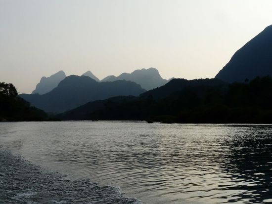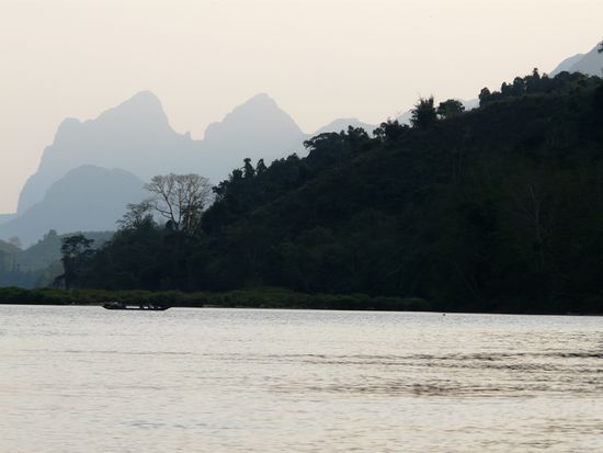 Wir dachten, der Bootsführer würde nun Gas geben, um den Zeitverlust wieder aufzuholen, schließlich war der Tag ziemlich fortgeschritten, aber er wendete das Boot und fuhr unter der Brücke zurück um am linken Ufer anzulegen. Er wollte, dass wir aussteigen. Völlig rätselhaft, warum er zuvor oberhalb der Brücke rechts gelandet war, wenn er uns nun hier hinaus werfen wollte. Ich versuchte ihm zu erklären, dass wir wie gebucht nach Muang Ngoi weiter wollten. Nein, er blieb beharrlich. Ich kramte meine Bestätigung heraus, wo eindeutig Muang Ngoi angeführt war und nicht Nong Kiao und stellte klar, dass wir das Boot allein gechartert hatten, mit der Vereinbarung stop where you want. Großes Geplapper unter einem guten Dutzend Laoten, die sich mittlerweile eingefunden hatten, und schließlich wurden wir aufgefordert, in ein neben liegendes Boot umzusteigen. Das war zwar wesentlich kleiner und unbequemer, und eine große Öllacke zog sich stinkend durchs Boot, aber wir fuhren weiter. Mit einem anderen Bootsführer. Die Ufer wurden nun sehr einsam, nur mehr der Fluss, der Dschungel und wir, und das schwächer werdende Tageslicht begann mit dem Wasser zu spielen.