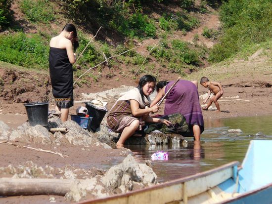 Immer wieder kamen wir an Dörfern vorbei, die meist zwanzig bis dreißig Meter über dem Fluss zwischen den Bäumen auszumachen waren. Wir hatten vereinbart, dass wir unterwegs ein Dorf besichtigen wollten. Gerade als ich überlegte, ob ich unseren Bootsführer mal anhal-ten lassen sollte, schien er denselben Gedanken zu haben und steuerte das Boot zwischen Wäsche und sich selbst waschenden Frauen ans Ufer.