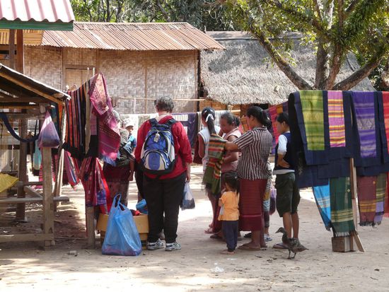 Plötzlich beim zweiten oder dritten Haus stellte sich eine ältere Frau neben mich und faltete ein buntes Tuch auf, das sie mir zum Verkauf anbot. Sehr bunt, wunderschönes Muster. Plötzlich packte mich eine junge Frau auf der anderen Seite am Arm, umklammerte mich mit ei-sernem Griff und zog mich, schob mich weiter Richtung Dorfmitte. Keine Chance, mich zu widersetzen. Was mochte die mit mir vorhaben? Hübsch anzusehen war sie ja, aber ich glaubte kaum, dass ich da ein eindeutiges Angebot bekommen würde. Zu viele Augen blickten da zwischen verschiedenen Bambuswänden hervor.