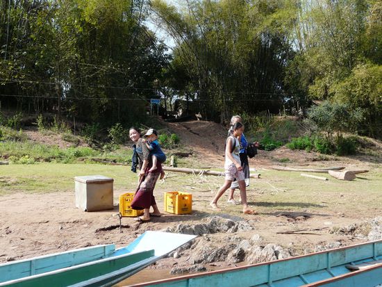 Ban Nong Kham stand auf einer Tafel, vom Dorf war nichts zu sehen. Wir sollten nach oben gehen, deutete unser Bootsführer den Weg hinauf. Die badenden Frauen schauten her und kicherten.