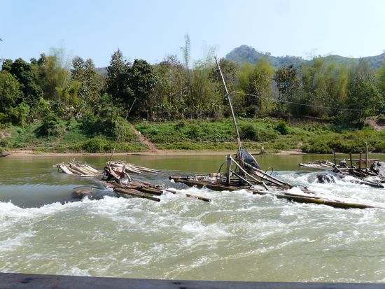 Zufrieden mit unserem ärztlichen Einsatz genossen wir die Weiterfahrt auf dem Fluss, Strom-schnelle um Stromschnelle. Wir sahen jetzt auch immer häufiger Kleinkraftwerke á la Laos. Man hängt ein Floß in die Stromschnellen, mit einem Laufrad, Draht zum Ufer, und es gibt Licht.