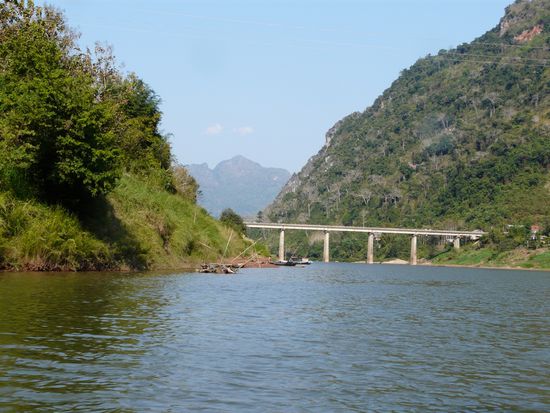 Endlich jemand, der verstand, was wir suchten und sogar einige Brocken Englisch beherrschte. Auf der anderen Seite der Brücke, Busstation, Post, die Erklärung war komplizierter als das Finden. In der Bus/Post-Station konnte man wirklich in Kip wechseln, der Kurs war sogar akzeptabel. Dann zurück über die Brücke, Böschung hinunter, ins Boot hinein.