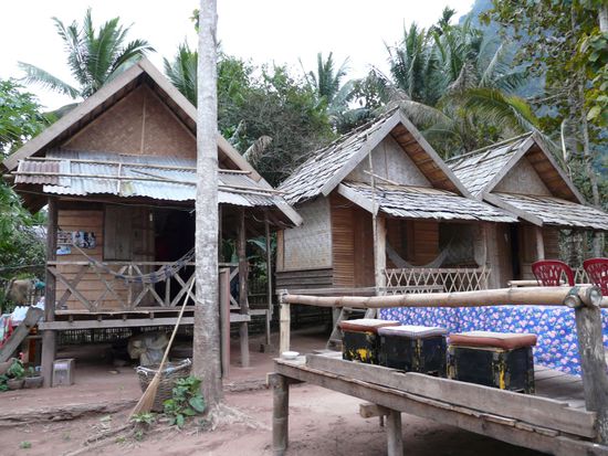Als wir endlich in Muang Ngoi anlegten, war vom Tag nicht mehr viel übrig. Wir waren er-schöpft, die Damen missmutig. Renate wollte unbedingt mit vollem Gepäck Zimmer suchen. Nach dem zweiten "no" waren die beiden bereit, sich mit den Rucksäcken niederzulassen und mich allein suchen zu lassen. Da wir an diesem Tag das letzte Boot waren, das angekommen war, waren wir auch die letzten auf Zimmersuche, was bedeutete, das alles, aber wirklich alles voll war. Ich arbeitete mich durch alle gackernden Hühner von Muang Ngoi, bis ich in der allerletzten Hütte am Ende des Ortes fündig wurde. Genau zwei Bambushütten waren hier noch frei. Immerhin Moskitonetze - und ein traumhaft schöner Blick über den Fluss! Keine Ahnung, was wir getan hätten, wenn auch diese Hütten noch voll gewesen wären. Die laotische Bevölkerung wirkt nicht gerade hilfreich, und schon gar nicht fantasiereich. Beim letzten Sonnenstrahl bezogen wir diese Unterkunft, bevor die Finsternis hereinbrach.