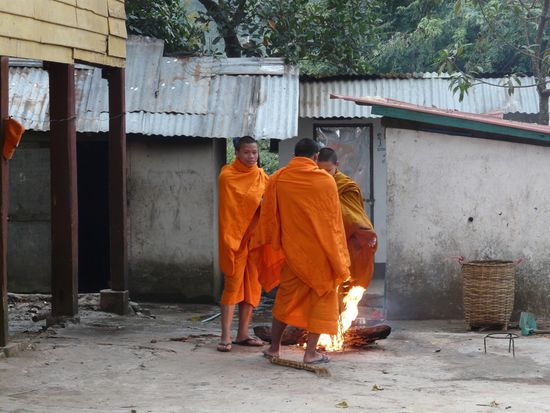 Um acht Uhr sind wir endlich überzeugt, dass wirklich kein Bus geht. Was tun? Der Minibus nach Sueng May fährt erst am späteren Nachmittag. Wir schaffen also unsere Rucksäcke wieder über die Leitern zum Nam Ou Guesthouse hinauf und fragen die Wirtin, ob wir sie bis zum Nachmittag auf der Terrasse stehen lassen können. Die ganze Familie ist in Tränen aufgelöst. Aber nicht, weil wir nicht abfahren können, sondern weil der Vater heute abgeholt und ins Spital gebracht wird. Wir können nicht mehr auf die Zimmer, soeben ist eine japanische Reisegruppe eingetroffen, die alle okkupiert. Wir frühstücken halt erst einmal und machen uns dann auf den Weg, um den Ort zu erkunden. Da ich links gestern schon war, gehen wir rechts, kommen zu einer Pagode, wo sich die Mönche im Hof am Feuer wärmen. Sie sind zwar nicht unfreundlich, aber wir haben den Eindruck, Störfaktoren zu sein.