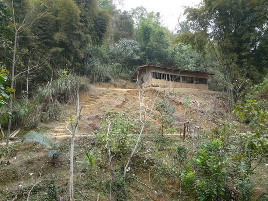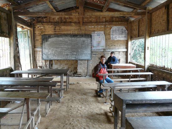 Ein Stück weiter sieht es aus, als wäre der Ort zu Ende. Hinter zwei Bauernhäusern führt ein schmaler Fußweg weiter, der an einer breiten, in den Lehm modellierten Treppe endet. Sehr interessant! Die halbverfallene Bambushütte oben entpuppt sich als Schule. Oberschule, nach den Inhalten an der Tafel zu urteilen.