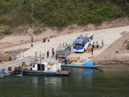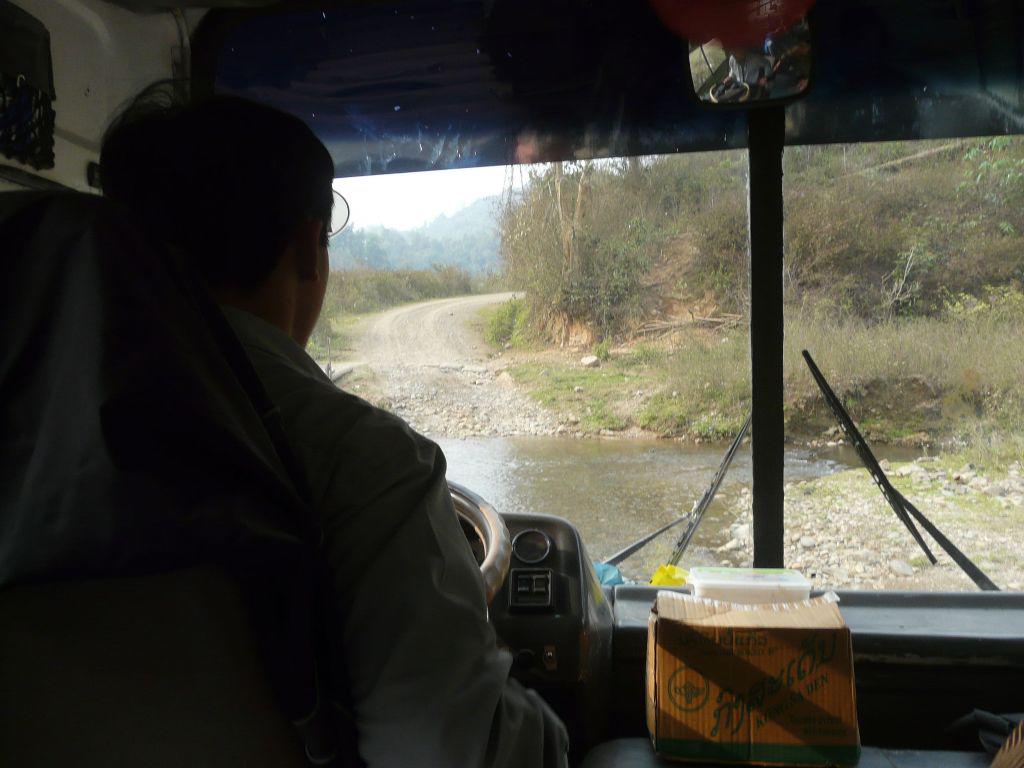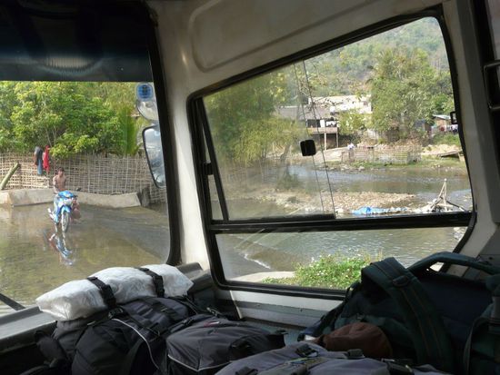 Schnell noch einige Ölfässer ins Businnere, mit Händen und Füßen zwischen Sitzen und diversen Metallteilen verkeilen, und los geht die Höllenfahrt. Landschaftlich ist die Strecke - wie nicht anders zu erwarten - wunderschön, aber die Schmerzen lassen einen kaum hochblicken. Ich hätte bei einer internationalen Verbindung so etwas wie eine Straße erwartet, aber es entspricht einer schlecht gewarteten Forststraße in unseren Alpen. Minus Brücken. Solche gibt es nämlich nicht. Bei jedem Fluss, bei jedem Bach, weiß der Fahrer genau, ob er sich im Schritttempo durchtasten muss oder mit Vollgas durchpreschen.