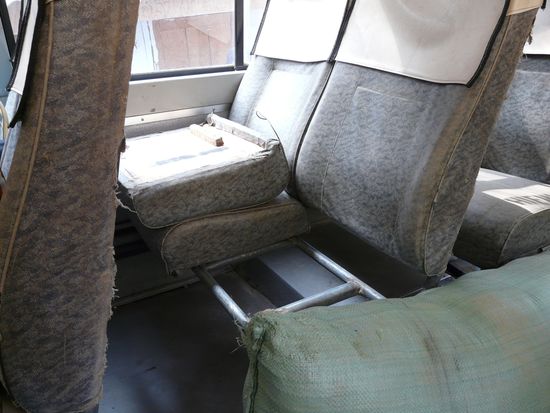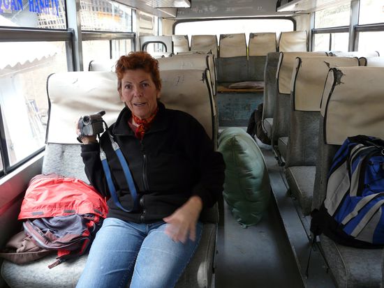 Die zweite Variante heißt, dass wir mit Köpfen und Gliedern gegen sämtliche Metallteile des Busses knallen, hin und wieder fällt mir auch ein Hammer, ein Schraubenschlüssel oder ein Brecheisen aus der Werkzeugkiste auf die Zehen.