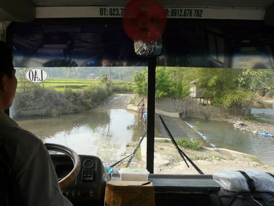 Kaum bei den Bussen angekommen, spricht uns schon ein jungerMann an, ob wir nach Dien Bien Phu wollen. Er schreibtuns auf, entweder heute 200 US-Dollar nach Dien Bien Phu, oder am Dienstag 15 US-Dollar. Bei dem Preis, meine ich, fahren wir lieber heute bis Sueng May, und morgen kommen wir schon über die Grenze. Wir sollen ihm ein Angebot aufschrei-ben. Ich rechne schnell. 15 Dollar durch drei macht 5, bei dreißig Passagieren hiermit 150, also biete ich ihm 90. Der Mann lacht böse und dreht sich auf die Seite. Ich habe Zeit. Nach einigen Minuten dreht er sich um und schreibt noch einmal 200. Gut, nun weiß ich, wo der Preis sein wird, biete also 100, wissend, dass wir uns bei 150 einigen werden, dem Preis für dreißig Leute. Und richtig. Halsabschneider. Fährt am Wochenende privat mit dem öffentlichen Bus und kassiert pro Fahrt mehr als 2 Monatslöhne. Aber für uns sind 50 Dollar pro Person verschmerzbar, und das weiß er. Der Bus ist ein Hit. Als Europäer kann man den ohnehin nur alleine chartern, kaum ein Sitz bietet genug Platz für die Beine, sofern überhaupt die Sitze noch verwendbar sind. Von außen sieht das Gerät um Klassen weniger schlecht aus als von innen.