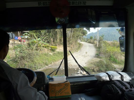 Zurück im Nam Ou Guesthouse zeigt unsere Wirtin plötzlich auf einen der beiden Busse am anderen Ufer, unser Bus nach Sueng May.