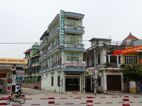 Endlich kann unser Chauffeur wieder angasen. Es dämmert bereits, und im reichen Vietnam gibt es sogar ein schmales Asphaltband, also donnern wir den Berg hinunter. Auf dieser Seite gibt es kaum Dörfer, sodass wir sehr rasch auf Dien Bien Phu zufliegen. Als die Finsternis hereinbricht wird die Fahrt kriminell, ich kann mir nicht vorstellen, dass der Fahrer so viel mehr sieht als ich. Für die Hühner auf der laotischen Seite hat er gebremst, für die Radfahrer und Fußgänger hier herüben kennt er kein Pardon. Möglicherweise mag er seine Landsleute nicht. Dafür fragt er uns, in welches Hotel wir wollen. Da von Travellern in den Foren das Dien Bien Phu Hotel empfohlen worden war, nenne ich ihm das. Vor allem ist es angeblich ohnehin das einzige in der Stadt. Ich glaube, wir haben uns Erholung in einem richtigen Hotel verdient. Als wir in die Stadt fahren, hält der Fahrer an und fragt nach dem Hotel. Kennt niemand, also braust er weiter. Bei jedem Haus, aus dem etwas mehr Licht dringt, verlangsamt er die Fahrt und fragt, ob es dieses sei. Ja keine Ahnung, wie das Hotel ausschaut, wenn es nicht mal die Einheimischen wissen.... Bei der Tafel Umkehren verboten reversiert der Fahrer mit seinem großen Bus und fährt wieder zurück, hält bei einem Gästehaus und hupt den Besitzer wach. Nein, wir wollen ins Dien Bien Phu Hotel. Wieder über alle Sperrlinien umgedreht, und er braust weiter. Am Ende der Stadt ist der Busbahnhof, wo man uns aussteigen lässt. Dien Bien Phu Hotel? Die herumlungernden Gestalten weisen auf die Häuser gegenüber. Wir sind müde, wir sind gesundheitlich angeschlagen und uns ist inzwischen alles egal. Wirklich ist schräg gegenüber ein Guesthouse.