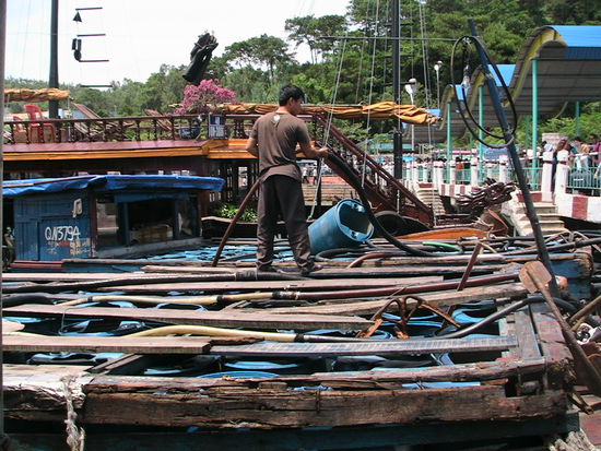 Als wir eine Fischerfamilie in einem der vielen schwimmenden Dörfer besuchen, frage ich mich, wie die das hinkriegen, daß weder die kleinen Kinder, noch die Hunde je über Bord gehen ? Ich habe nachgesehen: Weder die Klein(st)kinder, noch die Wachhunde verfügen über Schwimmhäute und Schwimmwesten sucht man auf den schwankenden Flößen vergeblich. Es gibt (fast) alles in den schwimmenden Dörfern, auch Schulen. Nur die älteren Kinder müssen Schulen auf dem Festland oder auf den größeren Inseln, wie Cat Ba, besuchen. Gegen Taifune schützt man sich im Windschatten der Kalksteininseln, es gibt viele sichere Buchten.
