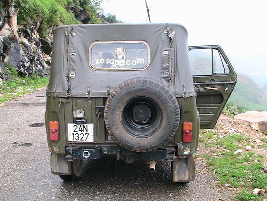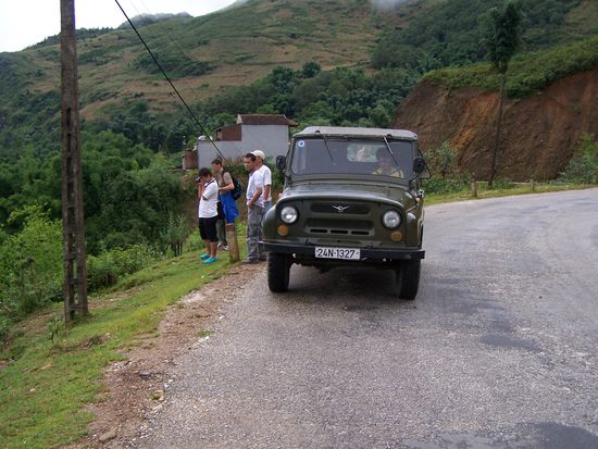Immer mal wieder regnet es, was nicht weiter störend ist, ist ja warmer Regen. Beängstigend finde ich allerdings teilweise den Straßenzustand. Da stürzen ganze Wasserfälle die Hänge herunter und quer über die Straße oder man muss große Schlammberge mitten auf der Straße umfahren und hängt mit einem Rad fast über dem Abgrund oder der Asphalt besteht nur noch aus Asphaltbrocken, sodaß ich mehrfach einen Achsbruch erwarte, der aber ausbleibt. Diese Jeeps sind unglaublich robust ! Ein moderner Geländewagen hätte das Programm natürlich auch geschafft, aber diese rappelnde Blechkiste ist schon urig ! Normale Fahrzeuge kommen übrigens nicht durch - wie sehen einige, die umkehren mussten...