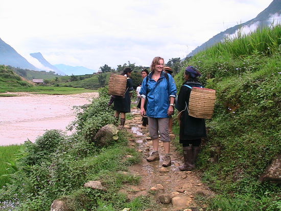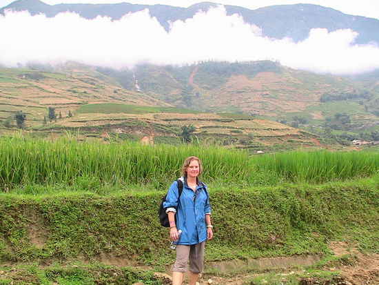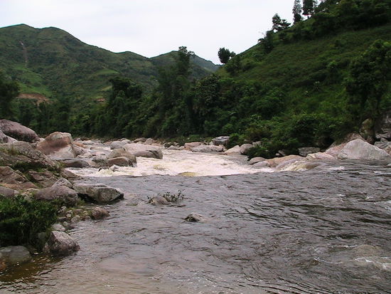 Wir wandern zunächst zu einer heißen Quelle. Der Weg dorthin ist schon mal eine schöne Schlammschlacht. Ich habe meine dicken Wanderboots an und die müssen keinen Sauberkeitswettbewerb bestehen, also patsche ich oft mitten durch die Schlammkuhlen hindurch. Lao will seine Schuhe offenbar schonen und balanciert manchmal abenteuerlich herum, nur um die Turnschuhe nicht zu ruinieren. Die heißen Quellen sind herrlich, es existieren sogar gemauerte Becken, in denen man normalerweise baden kann, aber die Becken sind leider dem durch die schweren Regenfälle reißenden Bach zum Opfer gefallen. Wir wandern zurück und machen uns auf zu einem anderen Fluss, in dem man (normalerweise) auch baden kann. Den Weg finden wir nicht sofort. Lao´s Ansicht nach, müssen wir durch´s Dorf. Dort stehen wir zwar dann vor dem richtigen Pfad, aber der führt über den Hofplatz eines kleinen Anwesens. Es ist niemand zuhause, außer dem Hofhund. Und der fletscht die Zähne, richtet sein Fell zur Bürste auf und lässt uns folgendes wissen:"Grrr rrrr rrrrh rooorrrrr !" Übersetzt bedeutet dies ganz klar "bis hierhin und nicht weiter !" Ok, wir kehren um. Treffen eine Frau, fragen nach dem Weg. Klare Sache: Wir müssen an dem Hund vorbei ! Normalerweise habe ich ein Händchen für Tiere, also versuche ich es mal mit täubchen-gurrender Stimme: "Gaaaanz lieb sein, wir tun dir nichts und klauen auch nichts und brechen auch nicht ins Haus von Herrchen ein". Na also, geht doch ! Mit festem Schritt gehen wir am Hund vorbei, der uns nur noch verwundert ansieht und außer leisem Grummeln nichts mehr von sich gibt. Der Pfad führt durch Reisfelder und über Stock und Stein. Logischerweise bin ich schon wieder patschenass geschwitzt. Aber wir erreichen den Fluss und wow ! Total schön ! Aber auch wieder eine reißende Strömung, an Baden ist nicht zu denken. So kippe ich mir nur literweise Wasser über den Kopf und sehe entsprechend wie ein begossener Pudel aus.