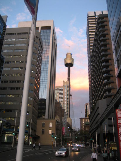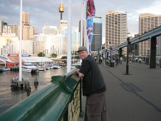 Nachdem ich vor lauter Warten auch für eine kurze Weile eingeschlummert bin, zwingen wir uns aufzustehen. Zu Fuß geht es durch den Hyde Park Richtung "The Rocks", um ein Restaurant für's Abendessen zu finden. Wir schaffen es aber nur bis Circular Quay, wo wir aber kein passendes Restaurant finden. Erschöpft setzen wir uns in einen Bus nach Darling Habour. Dort hatten wir einige nette Restaurants gesehen. Der Bus fährt aber zu weit. Deswegen wollen wir eigentlich eine Station mit der MonoRail Bahn zurück fahren. Die akzeptiert aber unser Ticket nicht. Also wieder zu Fuß zurück. Im Darling Habour essen wir im Food Court bei Kentucky Fried Chicken zu Abend. Auf dem Rückweg genießen wir die Abendstimmung und das wunderbare Licht der untergehenden Sonne.