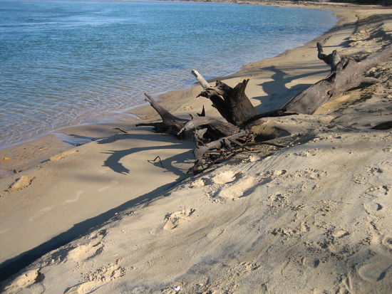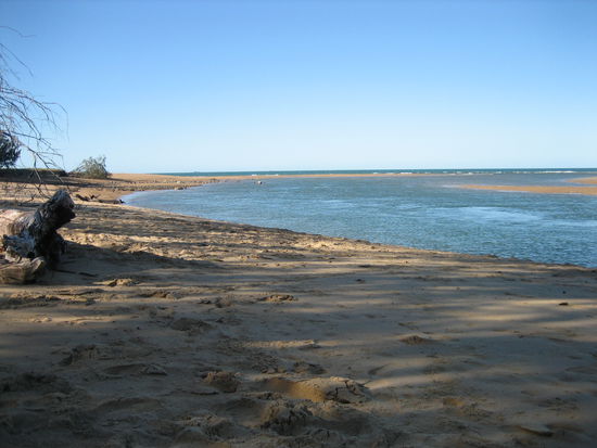 Nach einiger Kurverei finden wir unseren Campingplatz (29 $), nur durch eine kleine Straße von einer Flussmündung, bzw. vom Meer getrennt. Dort zieht es uns auch hin. Wir packen unsere Badesachen und laufen los. Leider gibt es wieder keine Schilder, daher landen wir zunächst an der teilweisen ausgetrockneten Flussmündung, die wir nicht durchwarten möchten, schließlich weiß man ja nie was da drin ist... Also wieder zurück zur Straße und weiter bis wir einen Zugang zum Strand gefunden haben. Der ist eher braun als weiß und zieht sich entlang der Flussmündung bis zum offenen Meer.