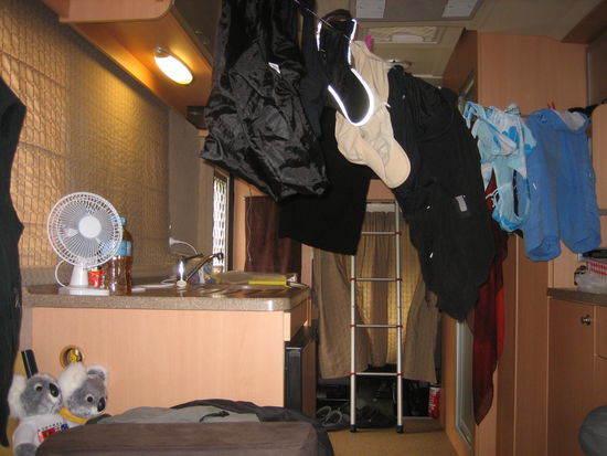 Es hat die ganze Nacht geschüttet wie aus Eimern. Der Regen ist im Camper so laut zu hören, dass wir fast kein Auge zugemacht haben. Es regnet bis mittags, dann hört es auf und wird schwül. Wir waschen unsere Wäsche und sind gezwungen, wegen der ständigen Regenfälle Teile unserer Wäsche im Camper zu trocknen. Thomas spannt die Wäscheleine im Zickzack zwischen die Schränke.