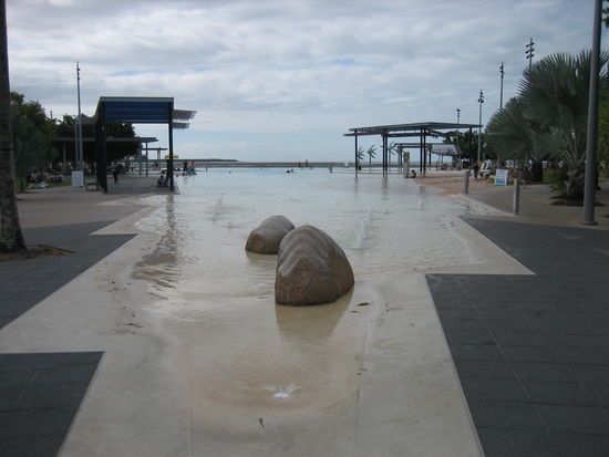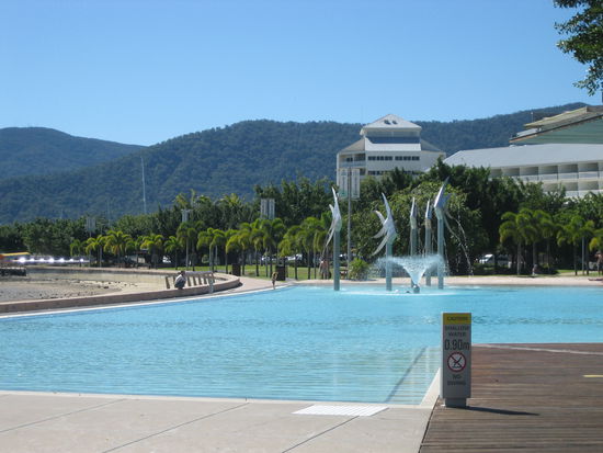 Vom Campingplatz wird ein kostenloser Busshuttle in die Stadt angeboten. Den nutzen wir und fahren um 15.00 Uhr in die Stadt. Dort sind wir angenehm überrascht. Endlich mal Leben, Menschen und Geschäfte. Da man in Cairns mangels Strand und wegen der Quallen im Meer nicht darin baden kann, hat man an der Esplanade ein Schwimmbad gebaut, das man umsonst nutzen kann.
